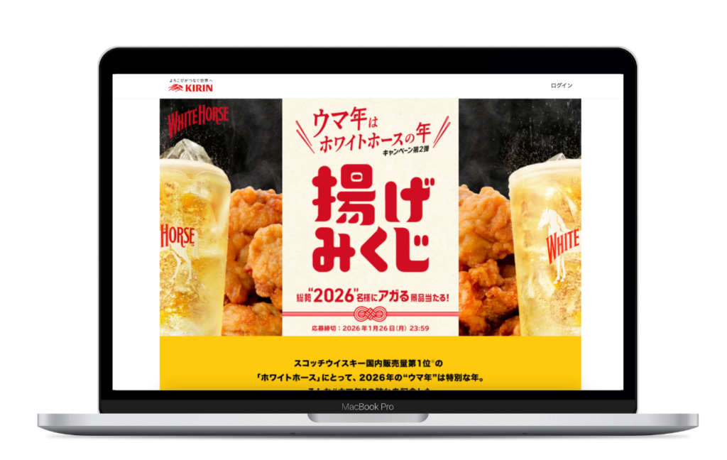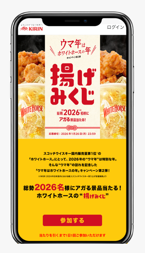 | キャンペーン概要 | 2026年の干支(午)とブランド名「ホワイトホース」を掛け合わせた正月キャンペーン。限定動画を視聴し、アンケート回答後、「揚げみくじ」を引くとその場で当たりがわかるインスタントウィン形式。 |