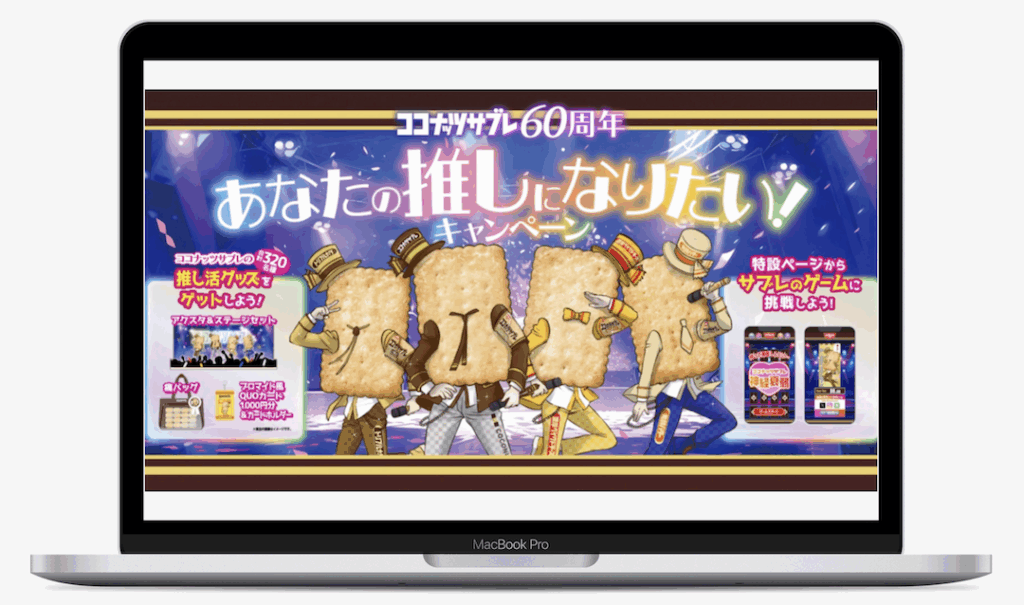 | キャンペーン概要 | 60周年を記念し、ココナッツサブレがアイドルグループとしてデビュー。各フレーバーを「推し」として設定し、レシートマストバイキャンペーンや特設サイトのゲーム(神経衰弱)を展開。 |