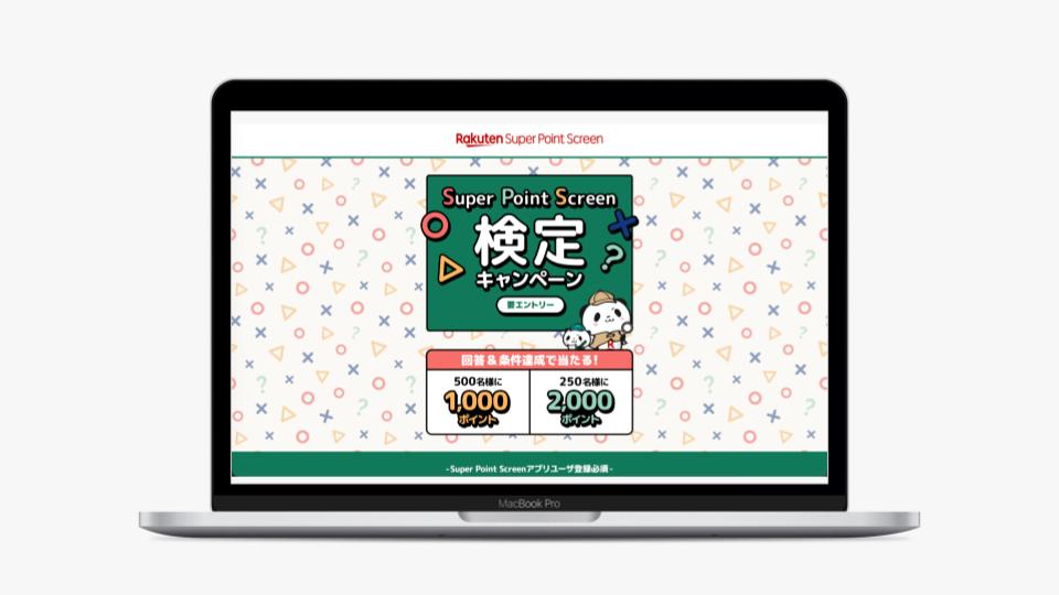 楽天が提供する Super Point Screen による、ポイント獲得を兼ねた検定キャンペーンです。アプリを通じてクイズに挑戦し、条件を満たすことで抽選で楽天ポイントが当たるという、「楽しみ × ポイ活」の掛け合わせ型企画です。
