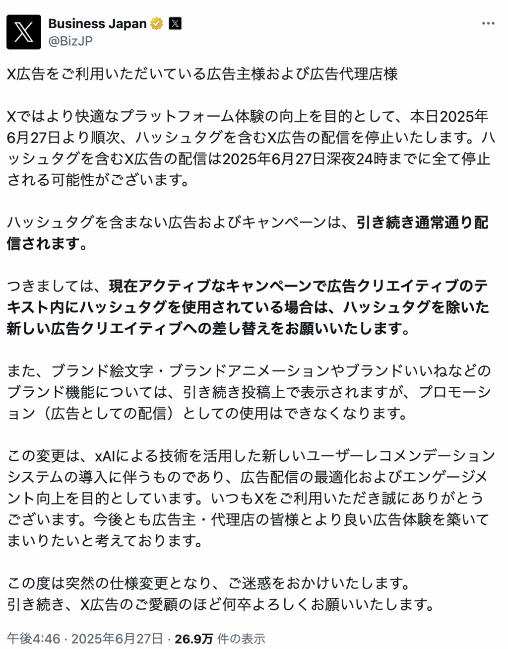 2025年6月27日にXの広告企業向けアカウント「Business Japan(@BizJP)」より、快適なプラットフォーム体験の向上を目的とした仕様変更が投稿にてアナウンスされました。